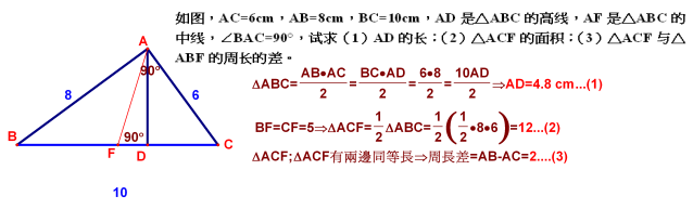 如图,AC=6cm,AB=8cm,BC=10cm,AD是△ABC的高线,AF是△ABC的中线,∠BAC=90°,试求(1)AD的长;(2)△ACF的面积;(3)△ACF与△ABF的周长的差。