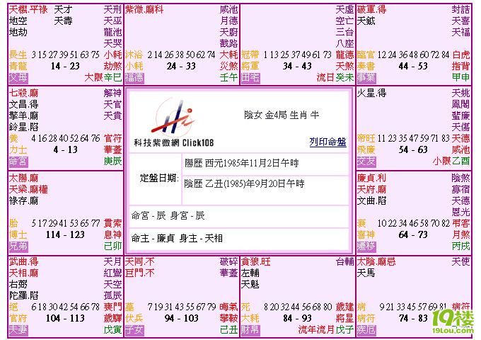 本人女,1985年11月2日11点45分生。麻烦各位帮我分析一下我的紫薇命盘,谢谢!